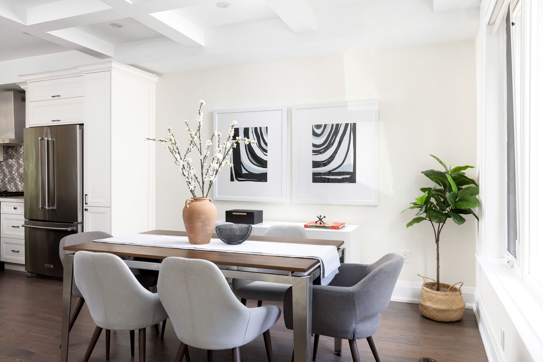 The bright, open-concept main floor features a rare powder room, hardwood floors, coffered ceilings in the dining room, and expansive windows that flood the space with light. The chef’s kitchen is a culinary dream, equipped with stainless steel appliances, a 5-burner gas range, and a spacious island with a breakfast bar. The adjoining living room opens to a serene, low-maintenance multi-level backyard, complete with a gas hookup for easy outdoor entertaining.