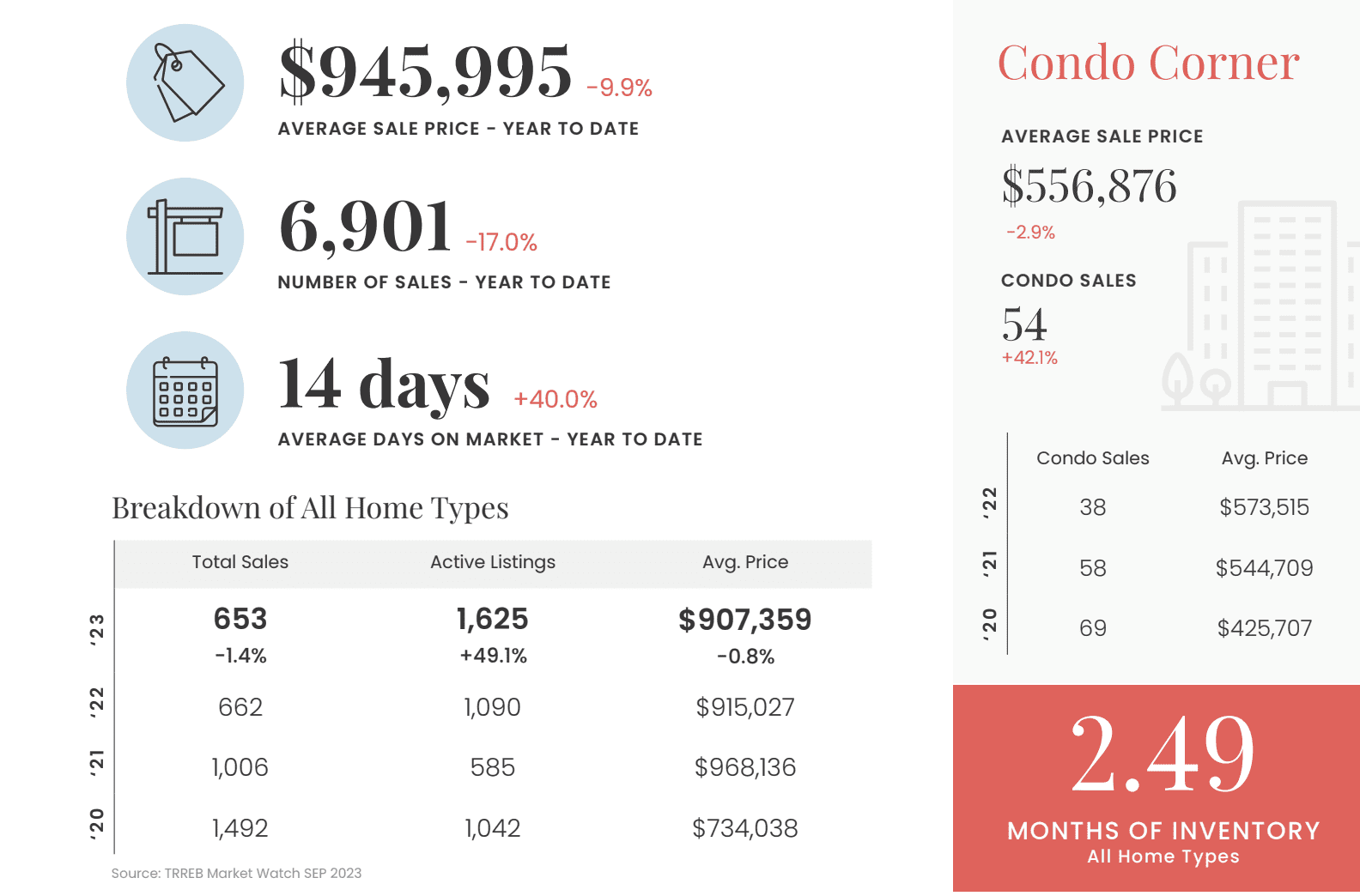 When looking at all home types in September 2023, the average sale price in the GTA was down 6.6% to $1,133,276 (year-to-date). When comparing the average year-over-year price in the GTA, prices were up 3% to $1,119,428. When zooming in on condos in the GTA, prices were down 3.3% to $707,065 (year-over-year) while the number of sales remained consistent (1,307 condo sales).
