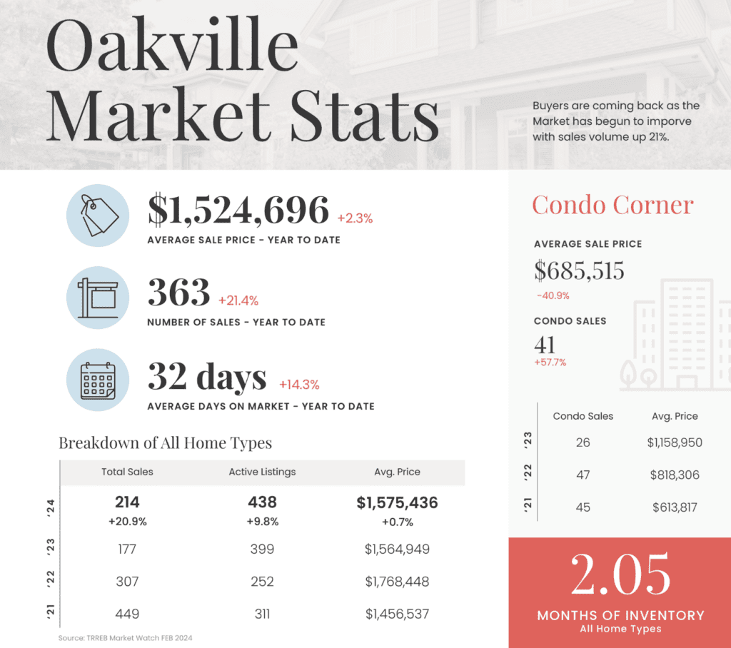 In February 2024, the average sale price (all home types) in Oakville was slightly up 0.7% to $1,575,436 compared to last year and the number of sales was up 20.9%. Condos prices in Oakville were down 40.9%, to $685,515. The number of condo sales was up 57.7% in February with 41 condo sales. Currently, we have 2.05 months worth of inventory (homes for sale in Oakville). If there were no more homes listed for sale, we would sell out in 2.05 months. As a result of the current market, listings are taking an average of 32 days to sell in Oakville.