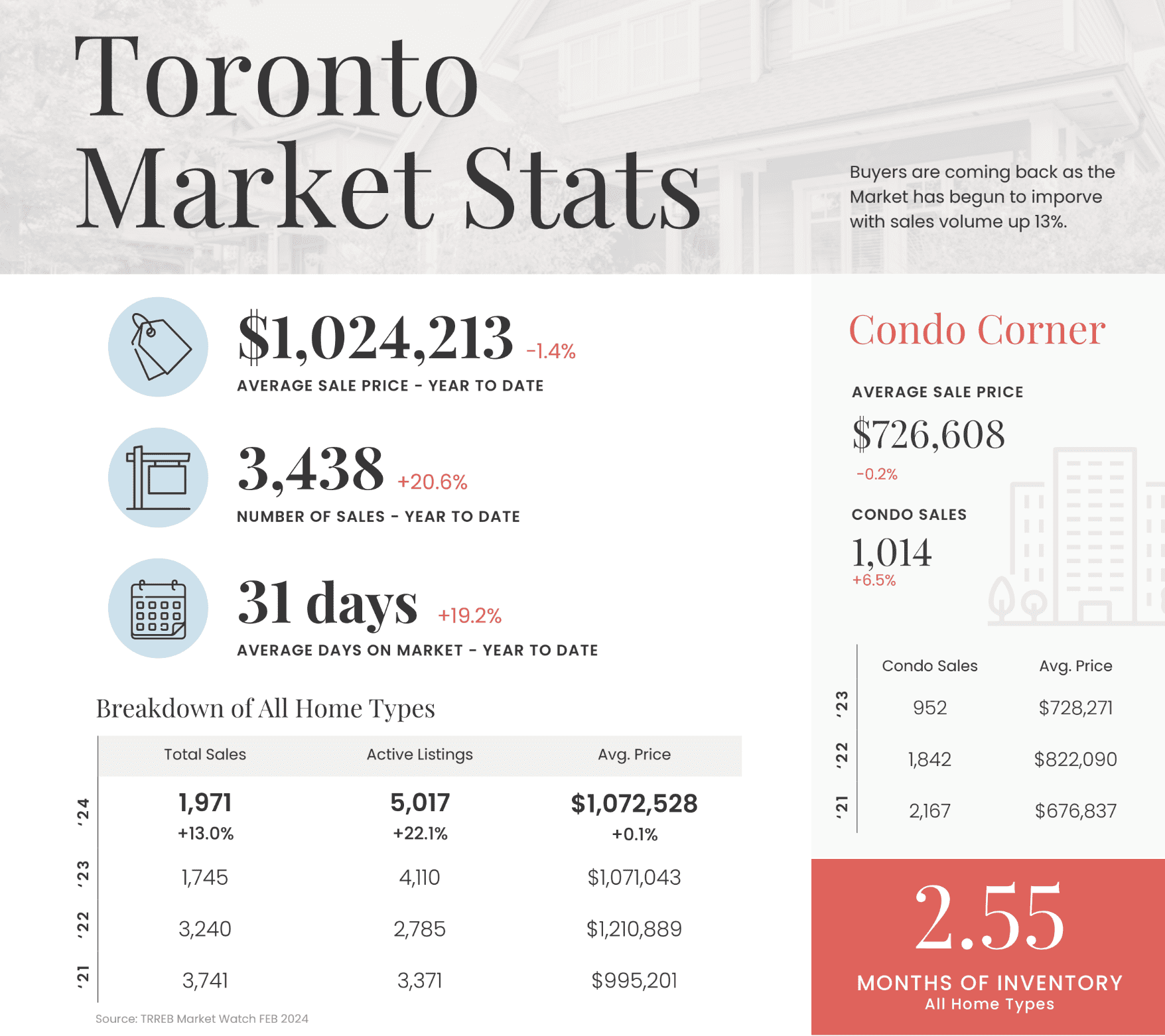 In February 2024, the average sale price (all home types) in Toronto was barely up by 0.1% to $1,072,528 compared to last year and the number of sales was up 13%. Condos prices in Toronto were slightly down 0.2%, to $726,608. The number of condo sales was up 6.5% in February with 1,014 condo sales. Currently, we have 2.55 months worth of inventory (homes for sale in Toronto). If there were no more homes listed for sale, we would sell out in 2.55 months. As a result of the current market, listings are taking an average of 31 days to sell in Toronto.